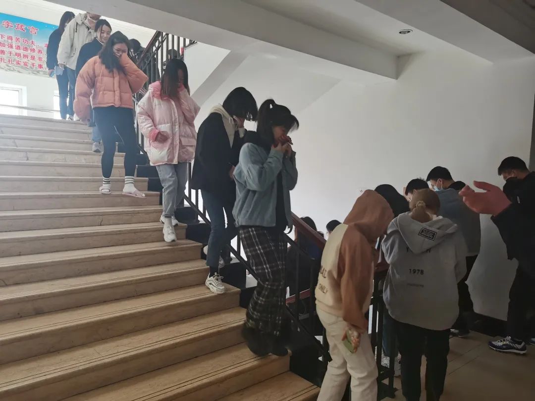 9:30分,演练活动正式开始。首先模拟起火点为三楼一间宿舍,第一个发现火情的同学第一时间拨打119报告火情和具体位置,然后拨打保卫科电话,与此同时大声呼叫同学迅速进行疏散。在学生会与保卫科引导人员疏散下全体学生用湿毛巾、手帕等捂住口鼻有序撤出公寓。整个应急演练活动规范、有序、紧凑、高效,按照疏散演练方案设定的逃生路线,迅速而有序地到达指定安全位置。