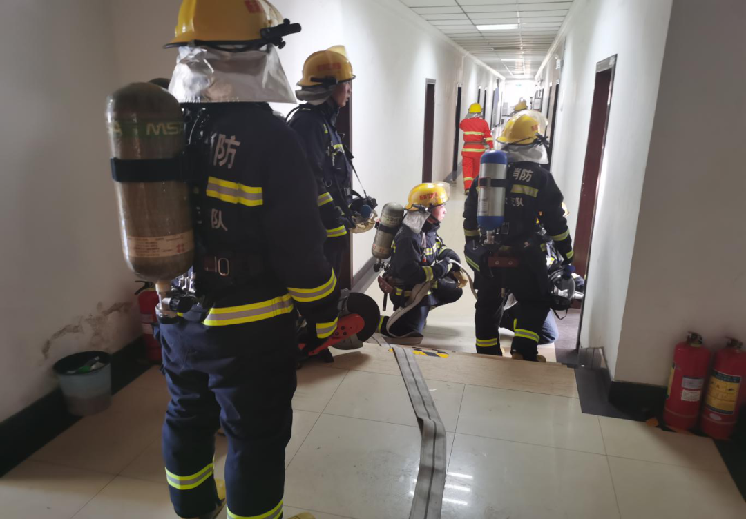 与此同时区消防支队迅速到达火场,最快速度整理装备,随着一声响亮的“准备战斗!”消防支队队员做好战斗准备,随即携带装备奔赴模拟火场进行扑救。
