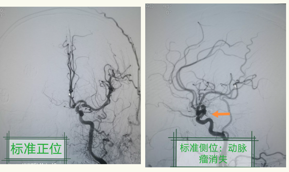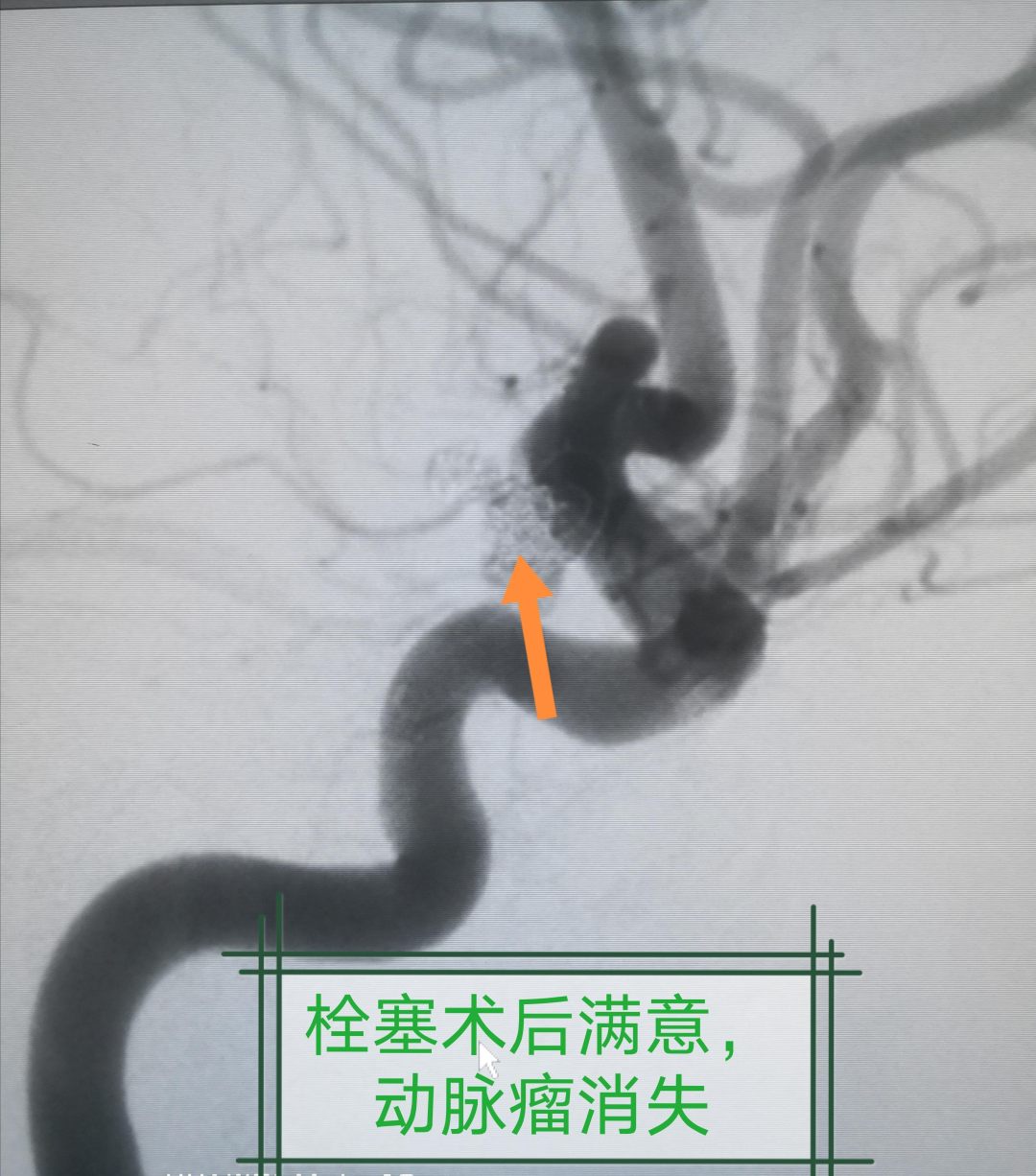 术后造影:证实动脉瘤栓塞满意,载瘤动脉通畅,颅内血管均通畅,血供良好。