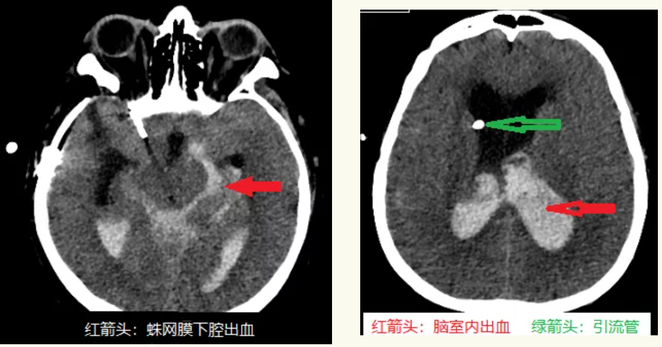 急诊行头CT显示:蛛网膜下腔出血、脑室系统内出血,脑室扩张,急诊科开通静脉通道,给予止血治疗,甘油果糖降低颅内压治疗,转运至神经外科时患者呼吸十分微弱,已经出现呼吸间停,血氧饱和度下降至84%,生命体征极不平稳,遂以“急性呼吸衰竭(中枢性)”急转至ICU。入院后给予镇静、止血、降低颅内压、控制血压、防止血管痉挛等对症治疗,病情稳定后神经外科副主任王宝庆带领主治医师郭知伟迅速为患者做了脑室外引流手术,梗阻性脑积水解决后,病人病情明显好转,逐渐恢复了部分意识。