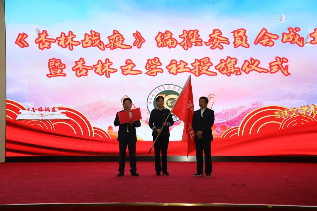 党委书记刘晖、院长党委副书记李忠原、文学社原社长胡凯共同见证《杏林战疫》图书编撰委员会成立。
