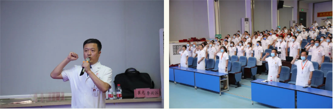 表彰大会在雄壮的国歌中拉开帷幕,全体医师起立,在医务部主任张羽镝的带领下,重温《医学誓言》,铿锵有力的誓言是我们对医学职业的承诺!更是对广大人民群众健康不忘初心的承诺!