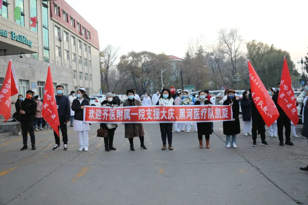 齐医附属一院支援大庆、黑河20名核酸采集人员圆满完成了50天的艰巨工作任务,10月25日16:00,医院在门诊楼为凯旋英雄们举行了简短而热烈的欢迎仪式,院领导班子、中层干部、相关科室医务人员及家属共同迎接英雄回家。