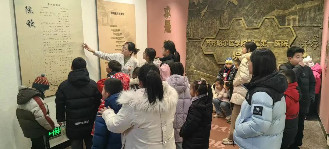 第五天,孩子们开启了一场特别的院史之旅。在宣传科副科长孙双滨老师的带领下,孩子们走进院史馆,看着一张张老照片、一件件旧物件,认真聆听医院的发展历程、医者的坚守故事。孩子们不时好奇提问,孙老师耐心解答,让大家在潜移默化中感受医者初心,懂得感恩与担当。