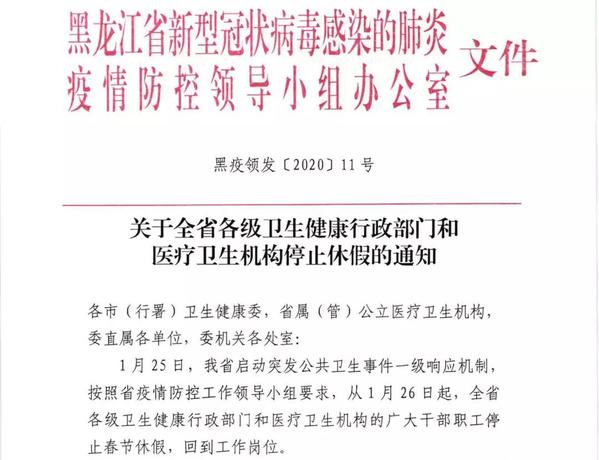 1月25日,黑龙江省新型冠状病毒感染的肺炎疫情防控领导小组办公室发布通知,全省各级卫生健康行政部门和医疗卫生机构停止休假。