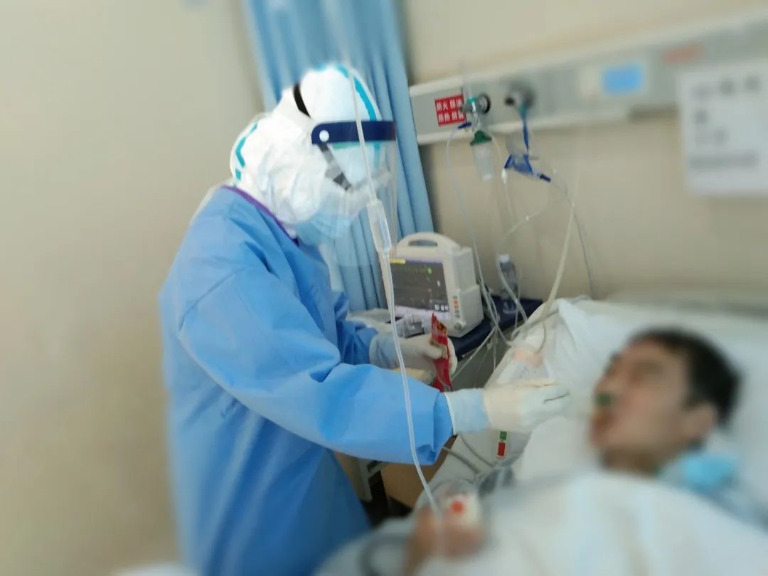 随着飞机的降落,我充分做好了步入战场的准备,穿上厚重的防护服,走起路来很笨拙,时间久了会头晕、恶心,护目镜遮挡视线操作很不便,防护服里汗流浃背,有时候面部、耳朵的皮肤会有疼痛感,却没时间去顾及已闯入一个可怕的病毒空间……踏进隔离区的那一瞬间,我们就全身心投入到救治患者的使命中。隔离区的病患都是重症,身为小组组长的我负责气管插管的重患,这对于不是ICU护士的我压力有点大,除了要帮助病人做好生活护理:吸痰、翻身、扣背、鼻饲、喂药、处理大小便、调整床位高度……治疗时更是小心谨慎,时刻观察病人病情变化,各种管路是否通常:留置胃管、尿管,深静脉、微量泵管、呼吸机管路等……气管插管上呼吸机的患者每次治疗都是与死神赛跑,每一次把病人的血氧饱和度提升起来,降低的血压回升,我都倍感欣慰。简易呼吸器通气,给予抢救药物,经过一番与死神的搏斗,把病人从死亡的边缘拽回来,精疲力尽的我会无比自豪。