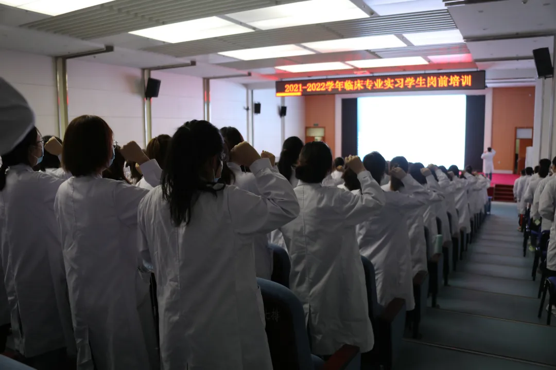在正式培训前,教务科科长徐清刚带领全体实习生进行医学生誓言宣誓,同学们高举右拳,宣誓“我志愿献身医学,热爱祖国,忠于人民,恪守医德,尊师守纪……为祖国医药卫生事业的发展和人类身心健康奋斗终生。”声音厚重、热烈,响彻每个学生的胸膛。