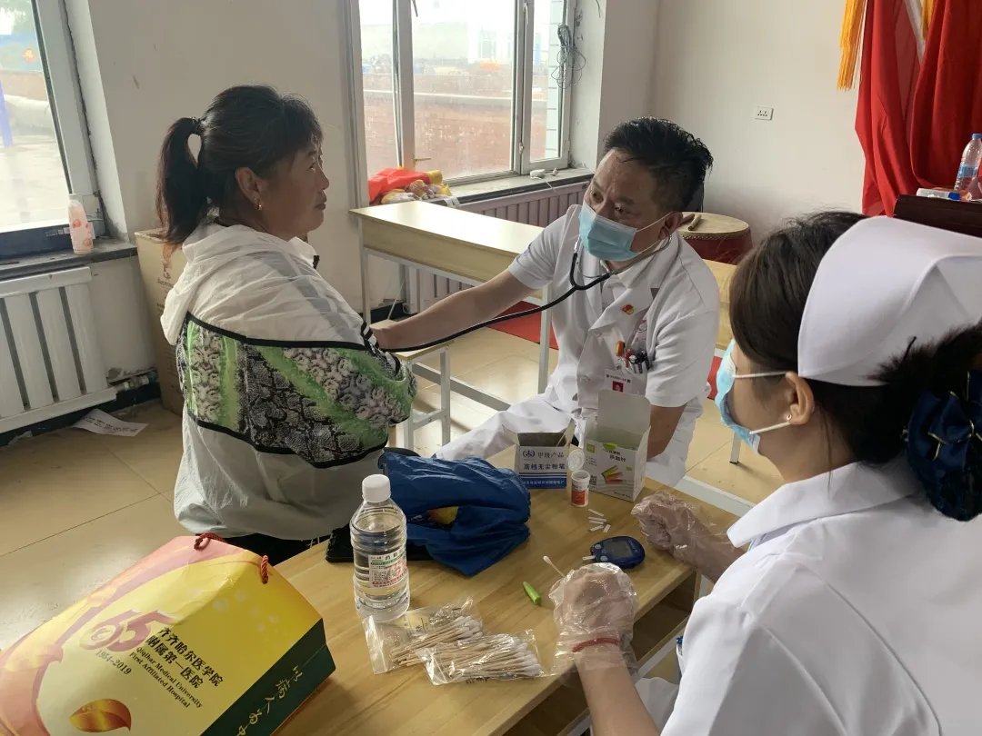 义诊现场,首届龙江名医骨外科专家曹立新教授、普外科一病区许景伟主任、呼吸内科主任林志国教授、神经内科五病区主任刘佳俊教授、心内科三病区刘佳副主任认真为乡亲们进行常见病、多发病的专业检查和康复指导,热心提供健康咨询,对血压、血糖异常者提出了合理的饮食、用药及诊疗建议,为大家讲解了常见病、多发病的预防知识和注意事项,超声医学科医生及两位护士为前来就诊的村民免费测量血糖、血压,同时进行免费的超声、心电等体格检查,医疗合作办工作人员现场维持秩序,为村民导诊,医务人员们认真、细致、热情的服务态度和工作作风,受到广大村民的一致好评。