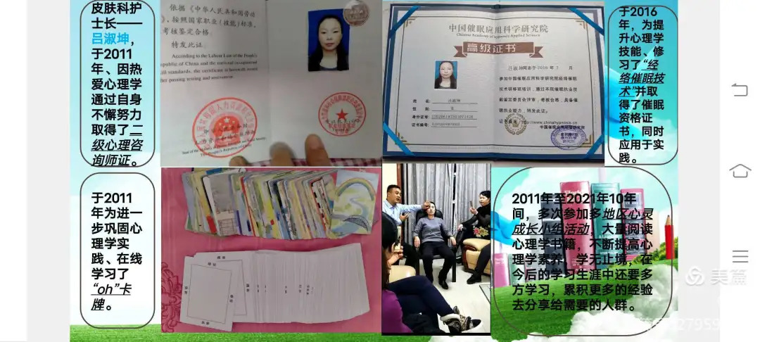 据了解,“心苑小筑”的两位组长(王玉凤、吕淑坤)都取得了二级心理咨询师证、催眠资格证等相关证书,十年间都在不断充实完善自己,为心理小组的成立做了充分的准备。