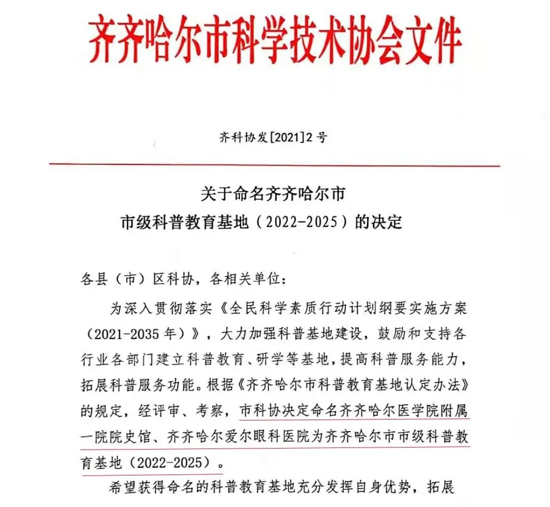 7月16日,齐医附属一院院史馆被齐齐哈尔市科学技术协会认定为齐齐哈尔市“科普教育基地”。