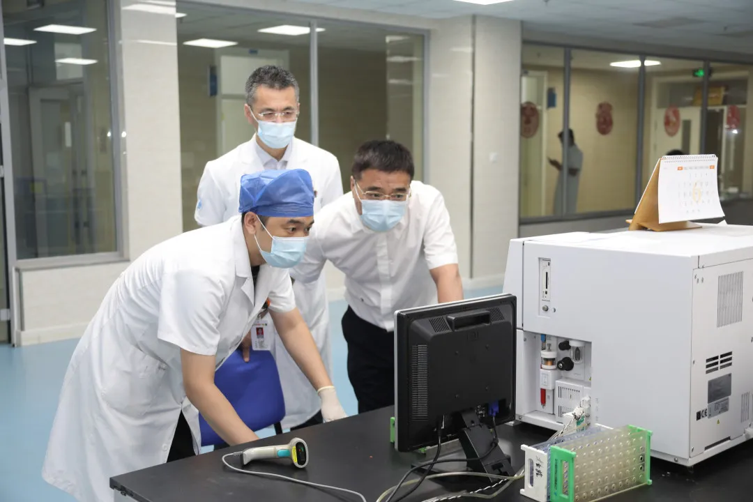 在检验科,检查组实地查看了我院核酸实验室消杀记录,李春旭处长强调核酸检测实验室要严格按照消毒规定操作,人员要做好防护,时刻保证生物安全。
