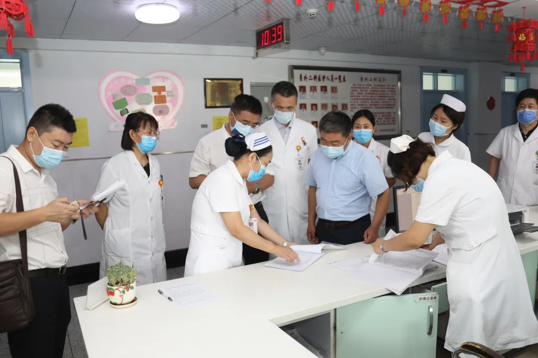 在普外科二病区及呼吸内科病房,检查组成员仔细询问了住院患者及陪护的管理细节,查看感控培训记录及新冠肺炎筛查情况。李春旭处长现场考察了保洁人员消杀服务知识,检查了电梯消毒记录,同时对病区的缓冲病房设置给予指导,使之更加科学合理,以应对疫情的需要。