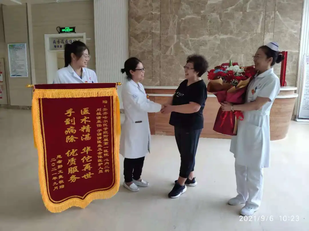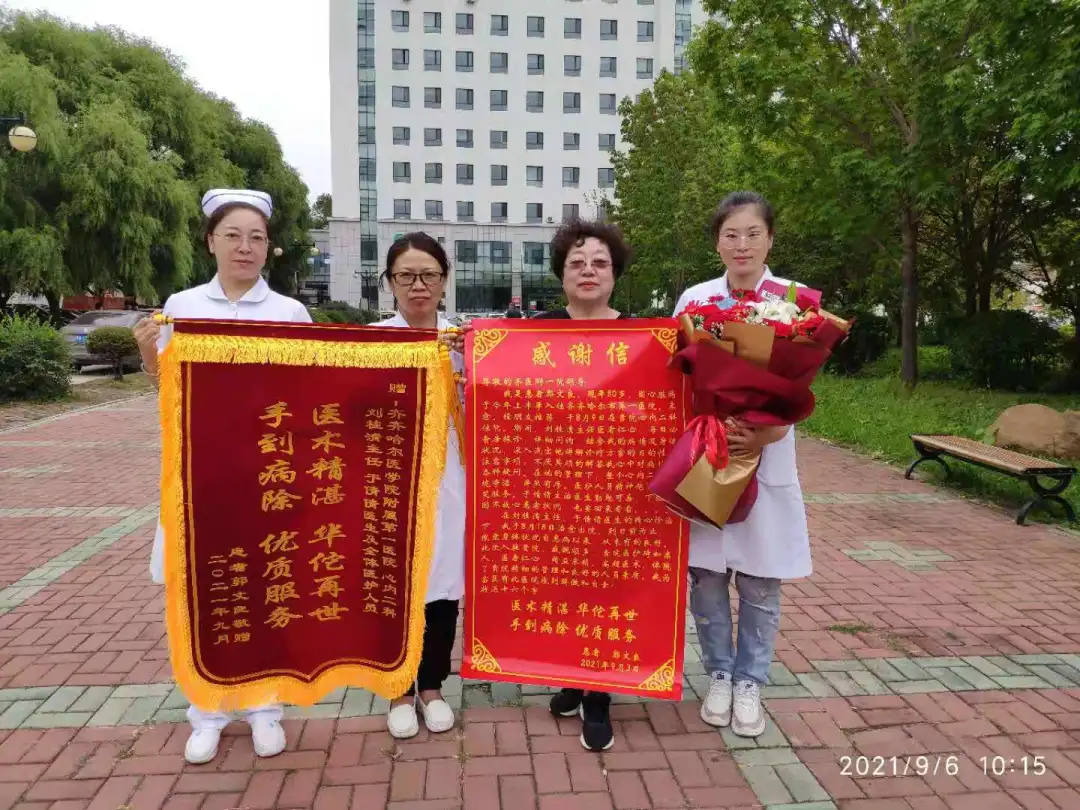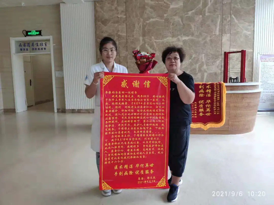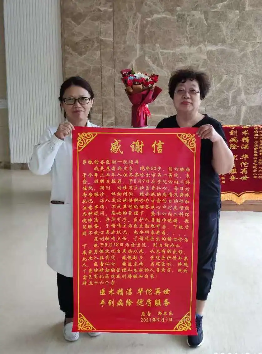 经过积极、系统的治疗,在全体医务人员细心的照料下,郭大爷很快好转出院。恢复良好的郭大爷,生活质量有了很大的提高,可他念念不忘的还是心血管内科二病区的“白衣天使”们,于是他特意嘱咐家人送来了献花、锦旗和感谢信,以表达他的感激之情。