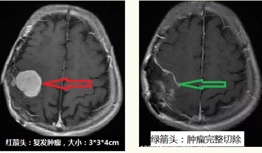无独有偶,51岁的于女士,11年前患脑膜瘤在外院手术治疗,术后恢复良好,但病人未规律复查。几天前无明显诱因突然出现左侧肢体活动无力,动作不协调,来我院门诊行头颅ct平扫见右侧顶叶手术区占位,考虑脑膜瘤复发,也入住我院神经外科治疗。