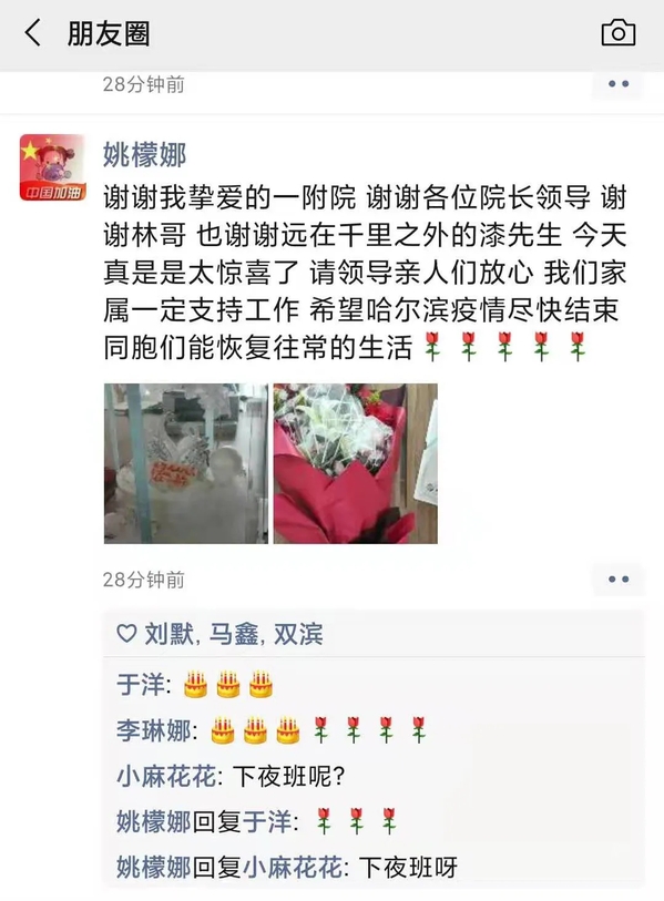 在抗击疫情的关键时刻,我院26名医务人员不惧危险,主动请缨,支援巴彦县,而漆毅是继援助武汉和哈尔滨之后的再次出征。这些天来,漆毅医生与其他队员一道兢兢业业,始终奋战在巴彦县抗击疫情的最前沿,充分展现了我院广大医务人员的风采。日前,漆毅想念同在医院康复科工作的妻子和两个可爱的孩子,无心说了一句“我媳妇要过生日了!”领队、工会主席陈珊珊就暗暗记在心里,默默联系主管院长艾立辉,并在网上提前预定了蛋糕。随即这个浪漫惊喜而意义非凡的生日就在众人的帮助下悄然发生……。