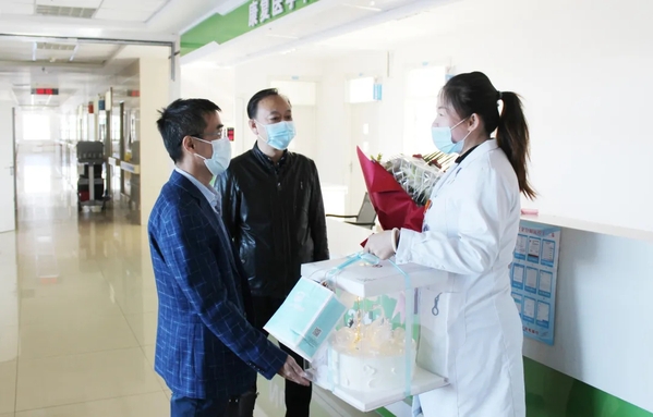 副院长艾立辉将一捧鲜花送到姚檬娜的手中。艾院长强调漆毅是好样的,医院为三次出征支援工作的他而骄傲,感谢姚檬娜对抗疫工作和医院的决定的无私支持,感谢她对家人的细致照顾,向姚檬娜及家人致以深深的问候和崇高的敬意,并祝福她生日快乐。