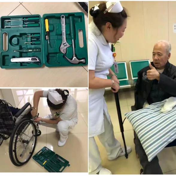 轮椅是患者常用的转移工具,因为使用频率过高,经常会出现一些小问题。为了及时处理这些问题,科室专门配备了工具箱和打气筒,当出现问题时,医务人员及时帮助维修,减轻患者的焦虑情绪,使患者可以更安心的治疗。
