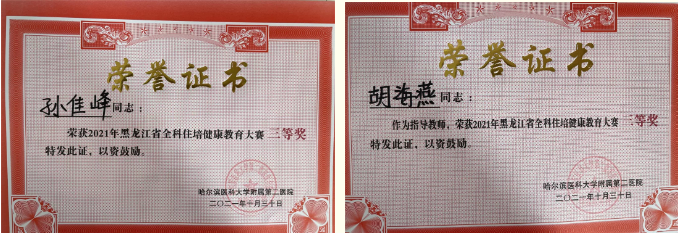 10月30日,“2021黑龙江省全科住培健康教育大赛”在哈医大二院全科住培基地举行,我院全科住培学员孙佳峰于线上参加比赛,荣获“2021年黑龙江省全科住培健康教育大赛”三等奖。全科专业基地负责人胡海燕教授担任线上评委,并作为指导教师,荣获“2021年黑龙江省全科住培健康教育大赛”三等奖。