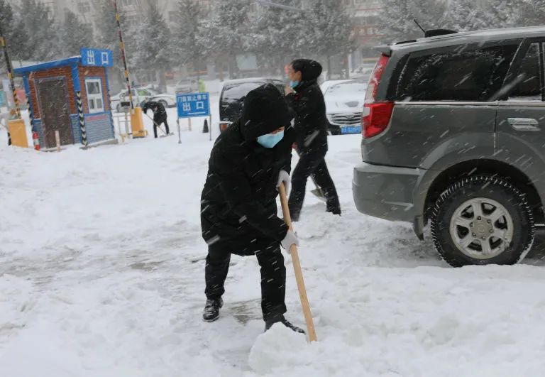 扫雪现场,医院领导身先士卒,职工干劲十足,大家不畏风雪、团结协作,有的用扫帚、有的用铁锹,经过大家的共同努力,积雪覆盖的路面清除干净。
