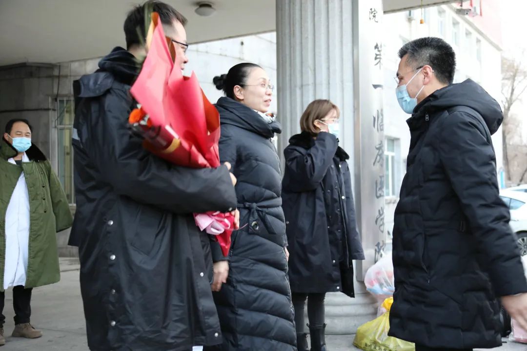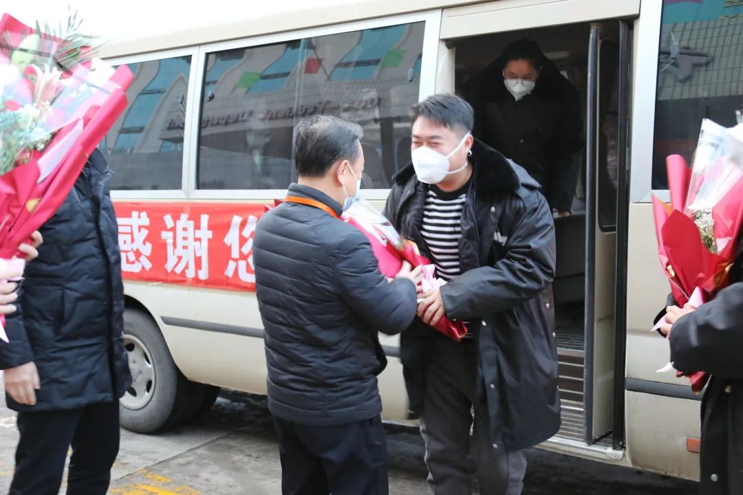 16:00,载着我院三名队员的中巴车驶进门诊广场,援助哈尔滨医疗队(巴彦方向)第一批返回的23名队员、院领导、医务部、护理部、相关科室医务人员及队员家属在门诊楼前热烈迎接。院领导向三名队员献上鲜花,并与全体26名队员合影留念。目前三名队员均已完成隔离观察,经过两天的修整,周一将回到工作岗位上。