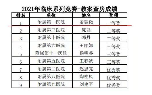 本次临床教学系列竞赛包括教案书写、教学查房2个项目,竞赛秉承了“以赛促教、以赛促学、以赛促建、以赛提高”的理念,共有9家附属医院的9名临床教师参加教学查房竞赛,25名临床教师参加教案书写竞赛。教案书写、教学查房竞赛采取上交教案、教学查房视频,组织专家集中评阅的形式进行。我院选派的教师脱颖而出,再创佳绩。