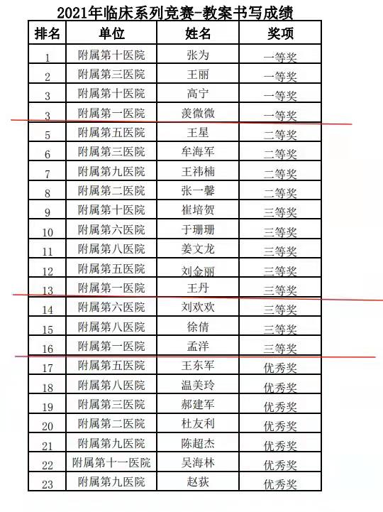 为强化临床教师教学基本功、理论与实践教学能力,激励广大临床教师积极投身教学,改进教学方法,进一步提高临床教学质量,齐齐哈尔医学院于10月下旬开展临床教学系列竞赛活动,并组织专家对参赛教案和教学查房视频进行评审。我院羡微微老师荣获教学查房、教案书写两项一等奖,王丹老师、孟洋老师荣获教案书写竞赛三等奖。