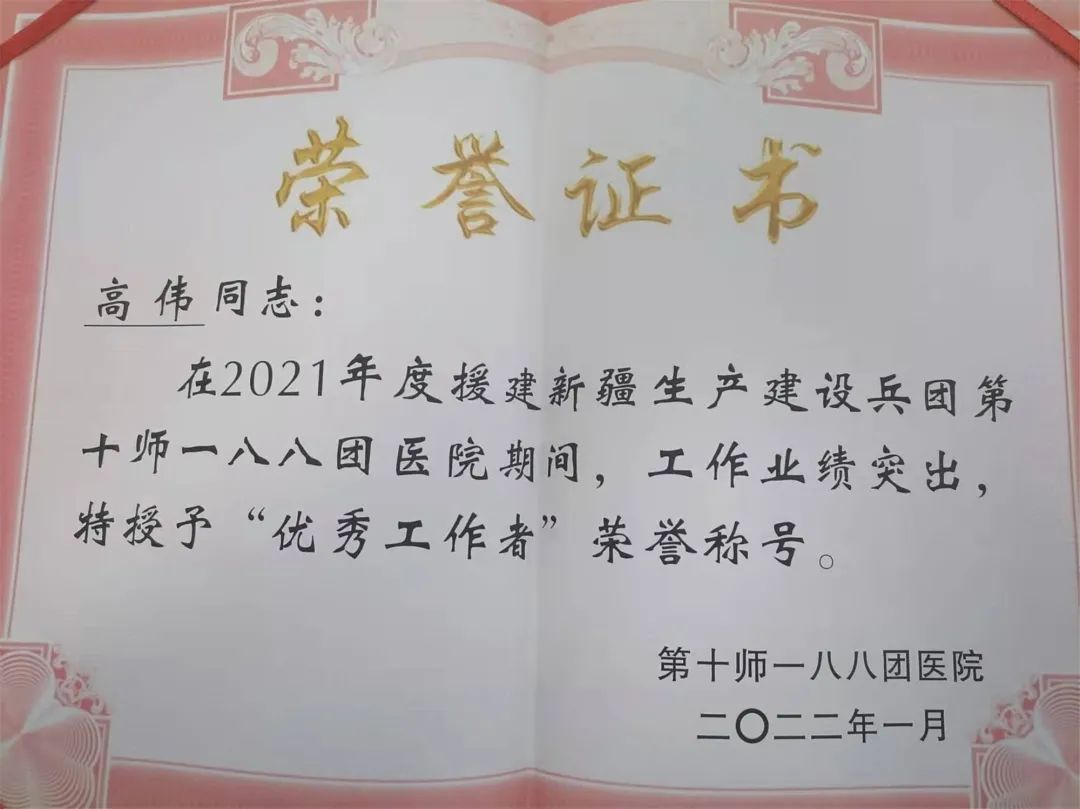 高伟同志牢记使命,砥砺奋进,为推动新疆地区的医疗卫生事业发展做出了积极贡献,援疆期间由于工作业绩突出,被北屯市第十师一一八团医院授予“优秀工作者”荣誉称号。