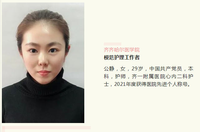 公静是一名普通的护士,2012年走进齐齐哈尔医学院附属第一医院,成为心血管内科二病区的护士,现踏上护理工作已经10年,2019年正式加入中国共产党。自参加工作以来,她深爱护理岗位,严格要求自己,坚持“一切以病人为中心”的原则,急患者之所急,想病人之所想,服务热心周到,竭尽全力为病人解决各种困难,用挚爱温暖病榻上的病人,用满腔真情感动着每一位患者的心灵,以自我的实际行动践行了一名护士的天职,受到了领导和同事们的一致认同和称赞。
