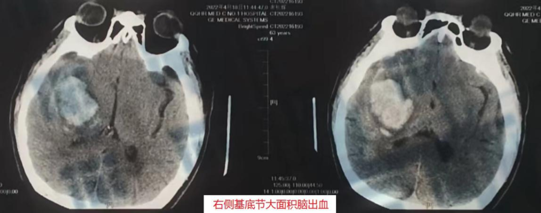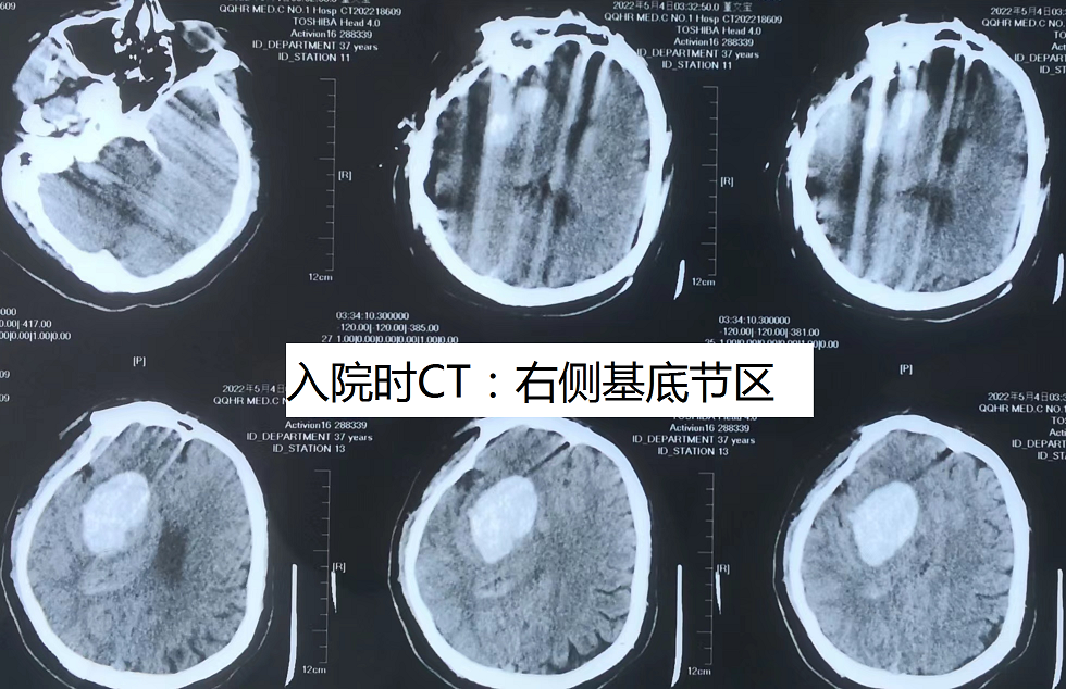 董先生,34岁,既往3年前左侧基底节区小面积脑出血病史,保守治疗后留有轻微构音障碍,语言交流无障碍脑血管检查未见动脉瘤,未见血管畸形。患者于入院前大约1小时突然出现左侧肢体活动不能,头痛,很快陷入昏迷,病人频繁呕吐,呕吐物为咖啡色,送至我院,急诊科医师查看病人后行头部CT检查明确诊断:右侧基底节脑出血。