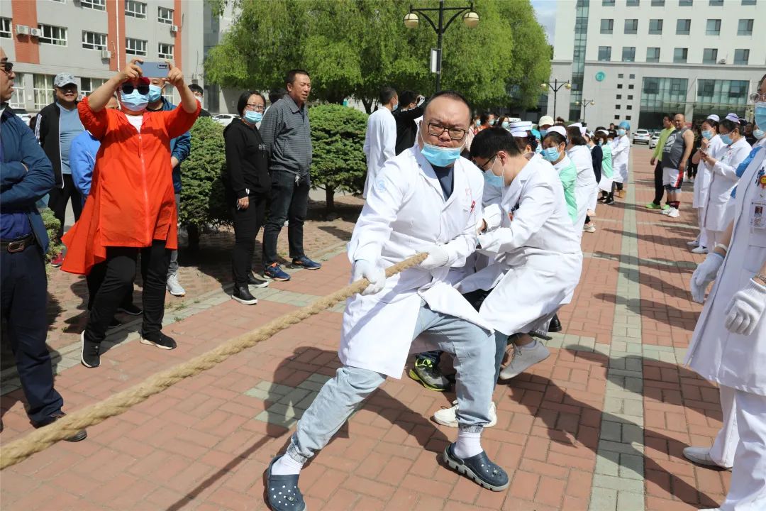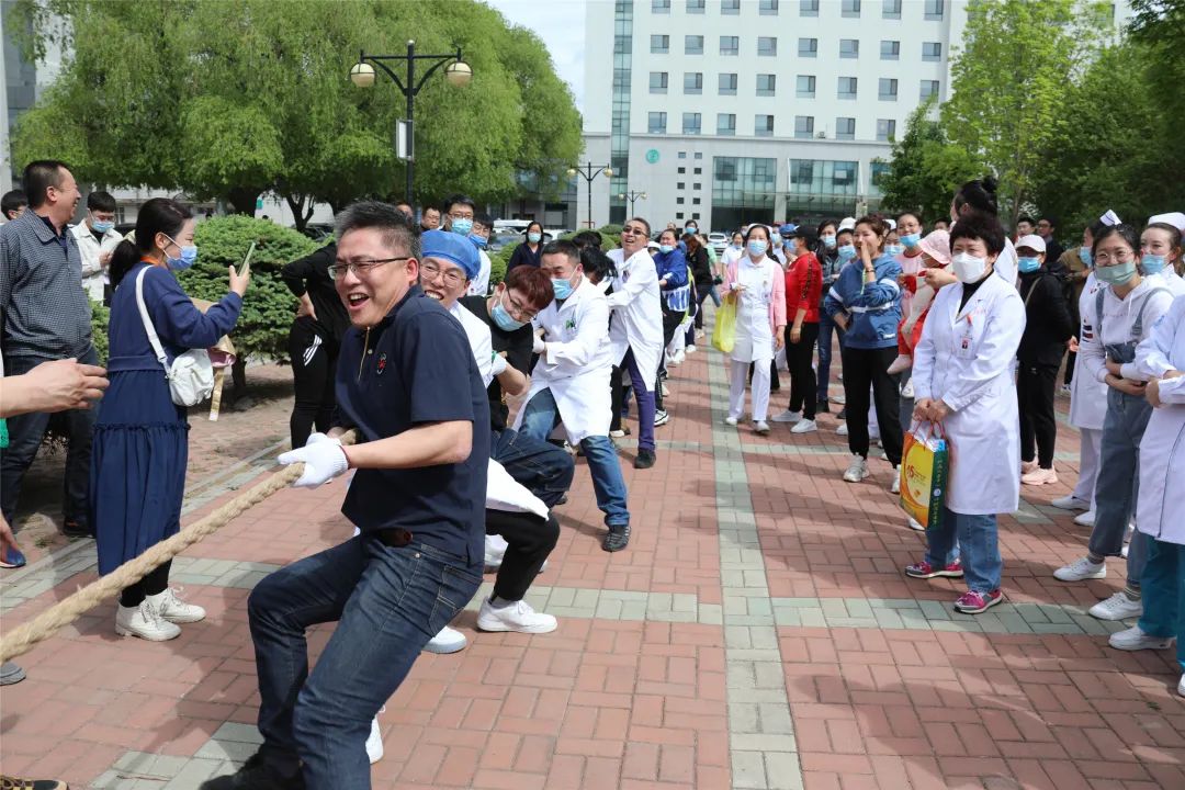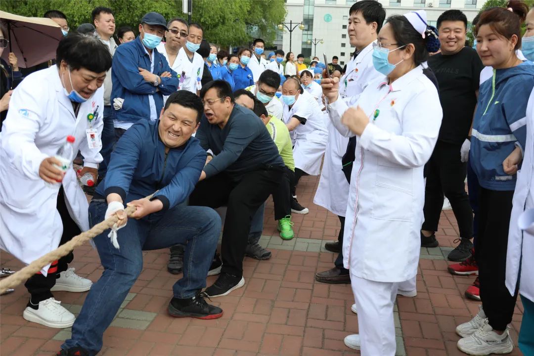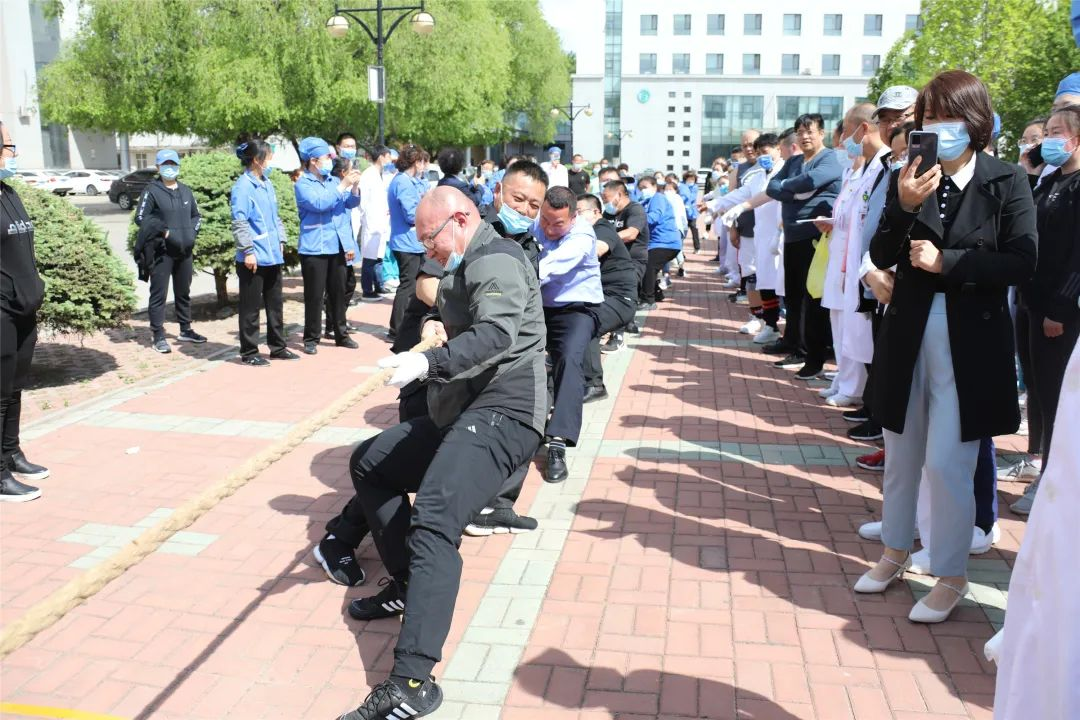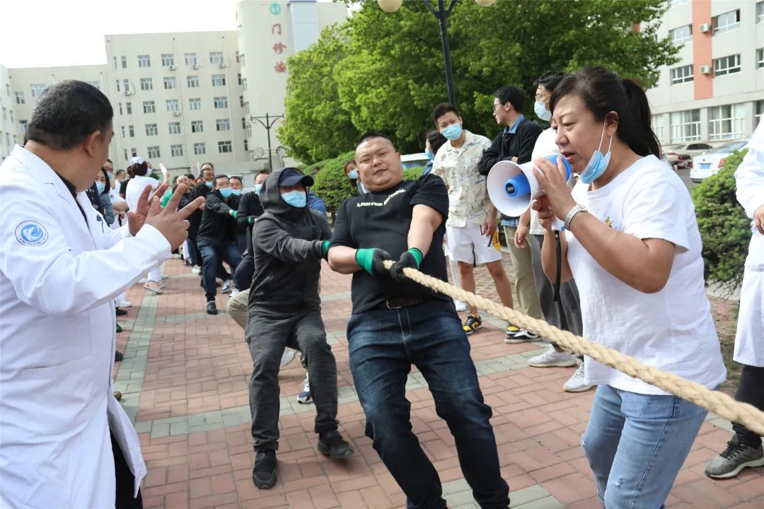 为喜迎党的二十大召开,丰富职工文化生活,培养职工团结友爱精神,5月26日下午14:00时,齐医附属一院在外科楼前,以积极向上、团结奋进、运动健康为活动宗旨,举办了一场精彩激烈的拔河比赛。党委书记刘晖、副院长艾立辉、刘增良出席活动,以工会分会为单位的11支代表队共计220人参加了比赛。活动由工会主席陈姗姗主持。