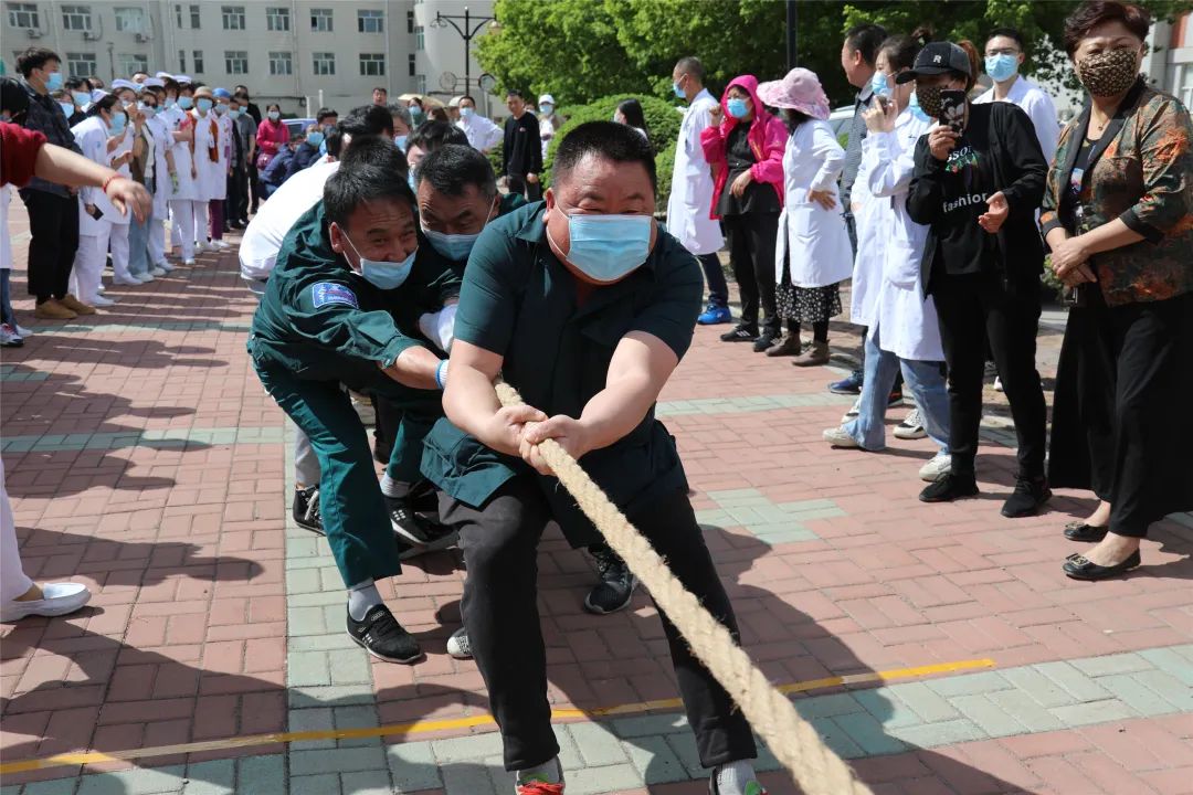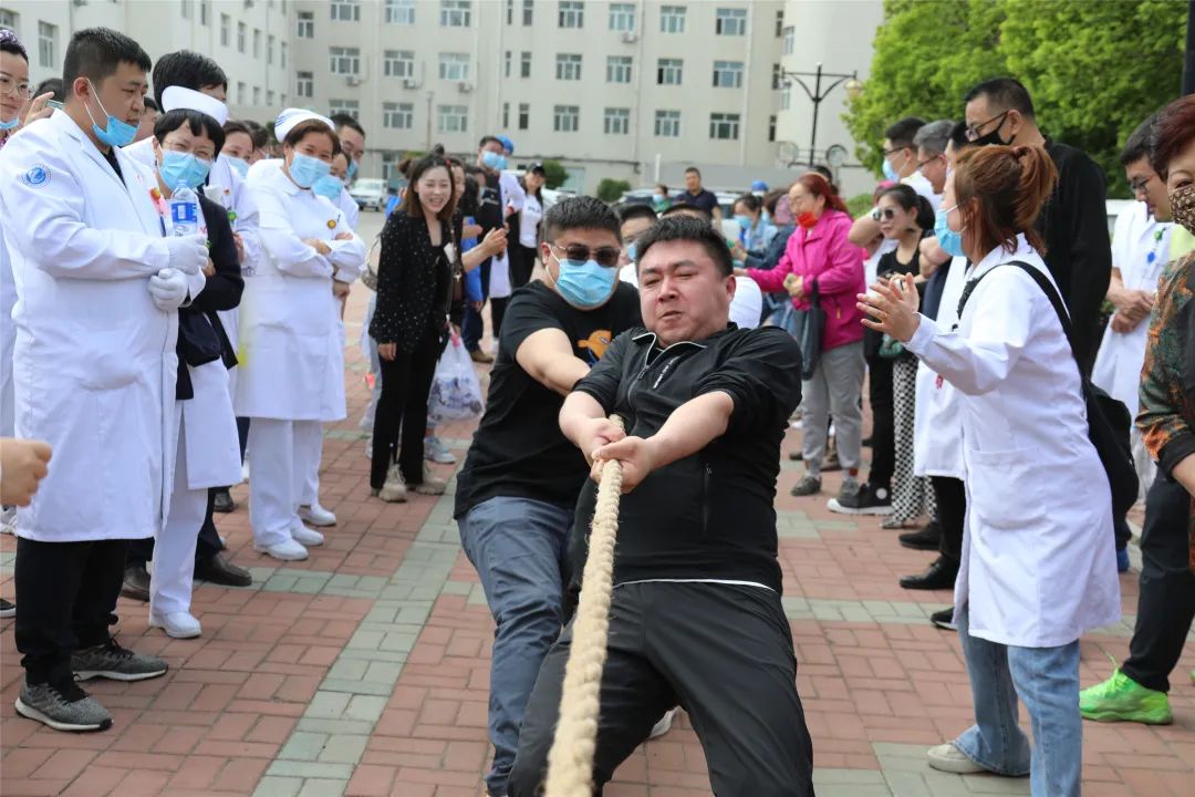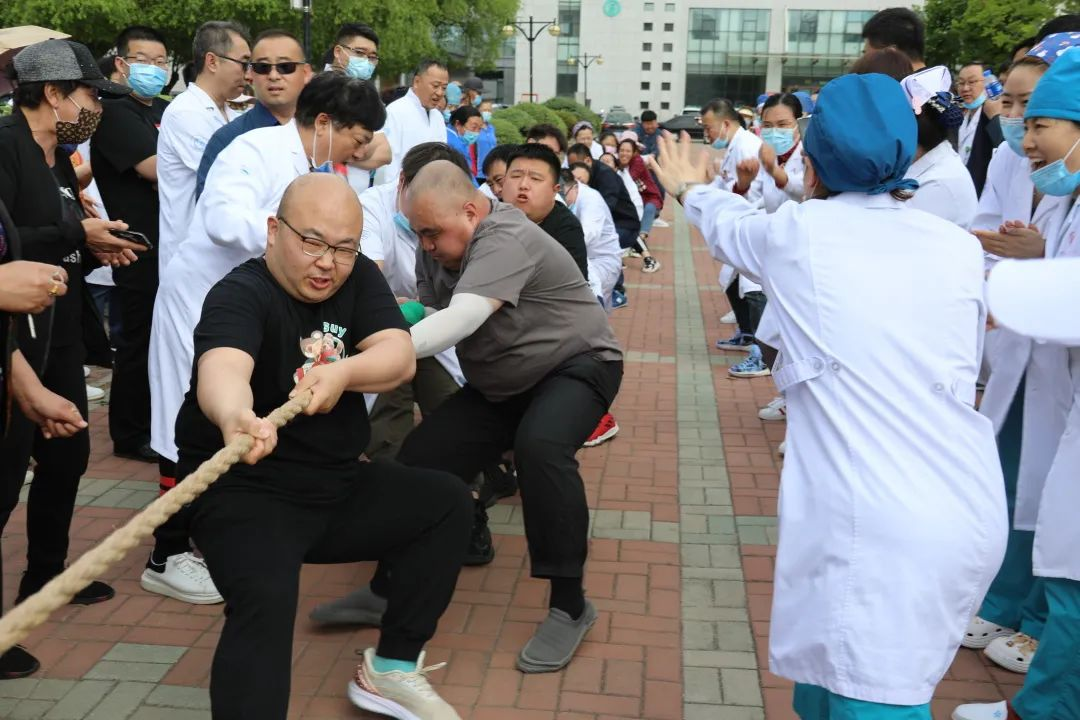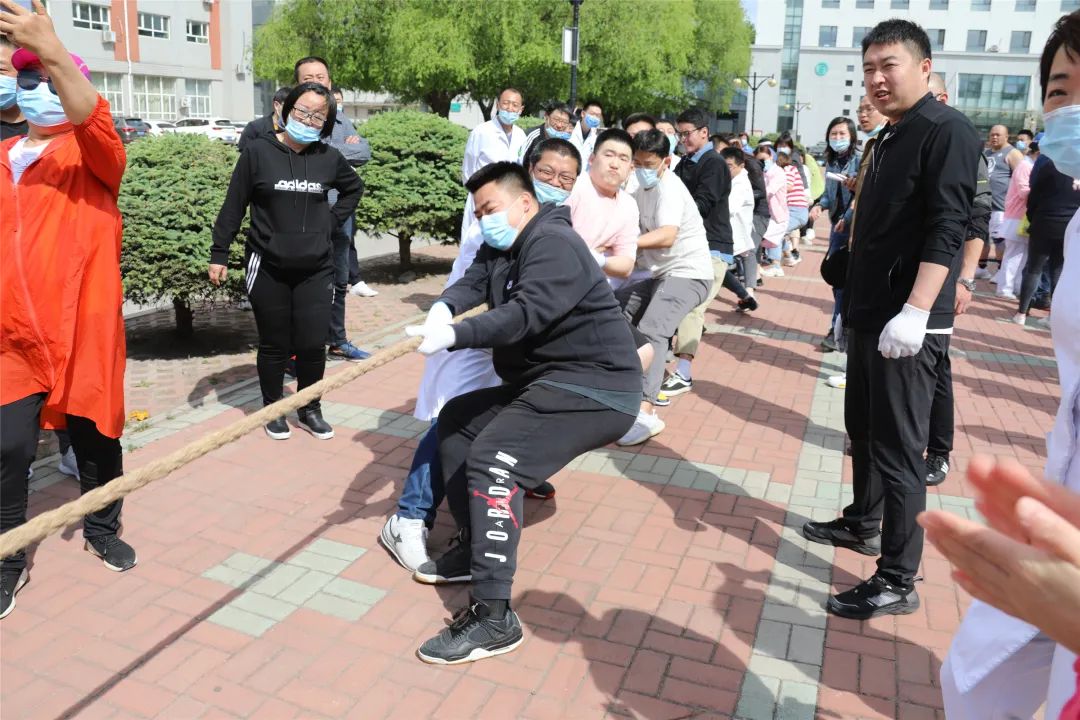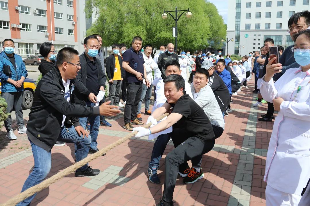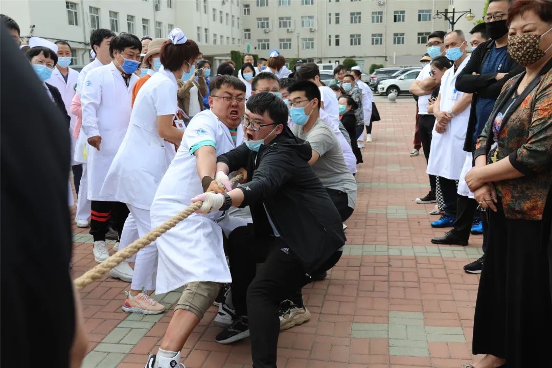 为喜迎党的二十大召开,丰富职工文化生活,培养职工团结友爱精神,5月26日下午14:00时,齐医附属一院在外科楼前,以积极向上、团结奋进、运动健康为活动宗旨,举办了一场精彩激烈的拔河比赛。党委书记刘晖、副院长艾立辉、刘增良出席活动,以工会分会为单位的11支代表队共计220人参加了比赛。活动由工会主席陈姗姗主持。