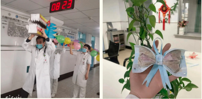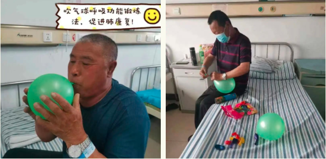 胸心外科信国玺主任与孙洪微护士长带领大家走进病房、走近患者,与患者利用进行肺功能锻炼的气球,制作了工艺品:龙的传人,不仅加强了患者呼吸锻炼,促进患者肺康复,同时也为端午节期间不能回家患者送去了节日的问候与祝福!