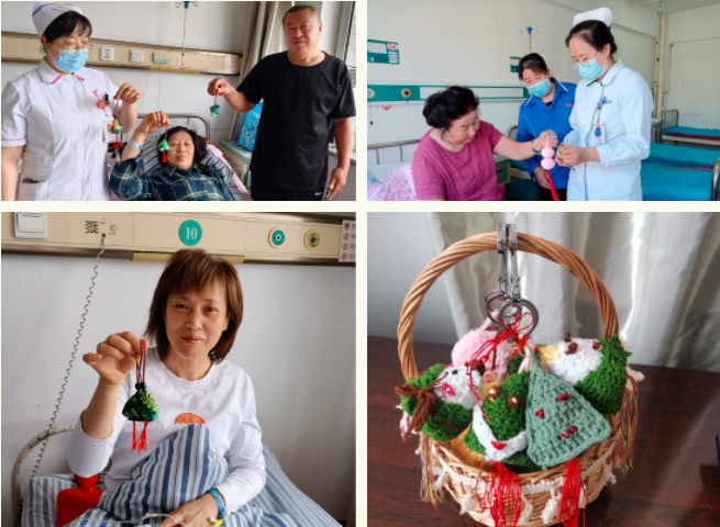 普外科一病区患者吴大姨的手灵巧舞动,针线在她手里飞来飞去,引得护士和患者对她赞不绝口,大姨也细心地教我们自己制作,在大姨的指导下,一个个可爱的毛线小粽子出生了,各种颜色的葫芦(福禄)娃也出生了。