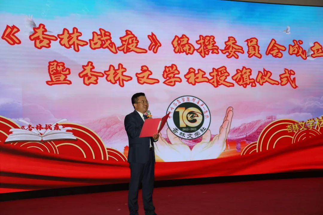 党委书记刘晖、院长党委副书记李忠原、文学社原社长胡凯共同见证《杏林战疫》图书编撰委员会成立。