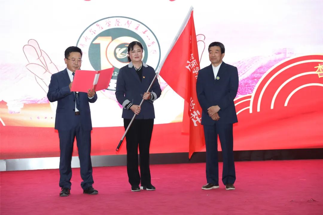 院长、党委副书记李忠原宣读了杏林文学社社长的任命文件,并邀请首任社长胡凯为新任社长刘晖授旗。一面写有“齐齐哈尔医学院附属第一医院杏林文学社”大旗郑重地交到刘晖书记手中。授旗仪式,是杏林精神的传承,使杏林之光更加熠熠生辉。