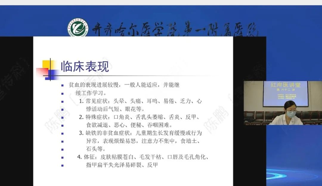 6月10日,齐医附属一院《红岸医讲堂》第六十二讲于线上开讲,我院血液肾内科副主任刘佳主讲——《防治缺铁性贫血》。
