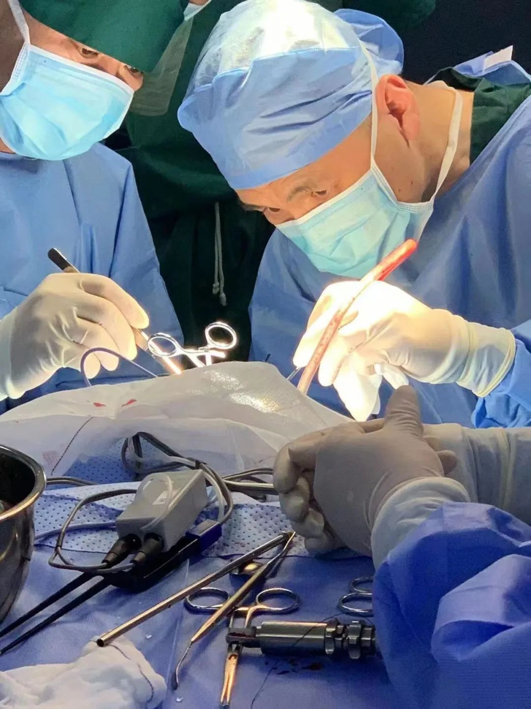 富拉尔基距离塔河县1400余里,经过七个多小时的颠簸,6月3日,端午节,中午12点,刘增良副院长走进了塔河县人民医院手术室……在刘院长的带领下,医护团队为患者行全麻下微创软通道血肿清除术。开头皮、钻骨孔、切开大脑皮层成功将软通道放至患者血肿腔中心,缓慢轻柔清除血肿约30毫升,生理盐水反复多次冲洗确认无活动出血后,缝合,包扎,固定创口。专家团队技术精湛,一气呵成,经过约40分钟的努力,微创软通道血肿清除成功完成。