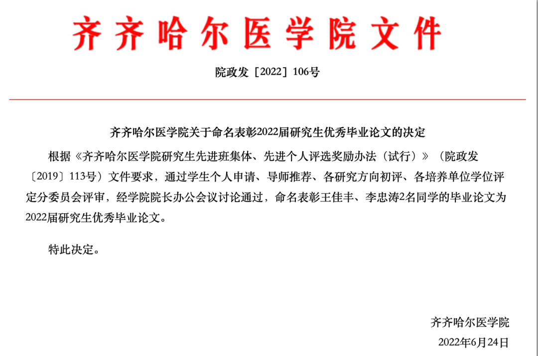 齐医附属一院培养的硕士研究生李忠涛学位论文荣获学院2022届研究生优秀毕业论文!