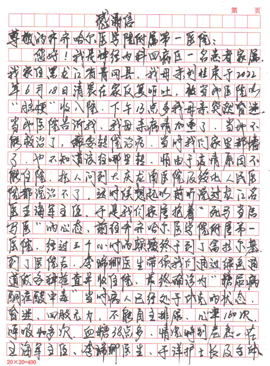 编者按:感谢信作为最传统的表达感谢的方式,在通讯手段高度发达的今天,依旧有着独特的魅力,洋溢着浓浓的“医患真情”。近日,齐医附属一院宣传科收到了一面锦旗和一封感谢信,是写给我院神经内科四病区医护人员的,真挚的话语让科室医护感受到阵阵暖心,看到了浓浓的医患情,这封“感谢信”是对神经内科四病区医护人员最大的肯定,同时也传递了医患关系的正能量!