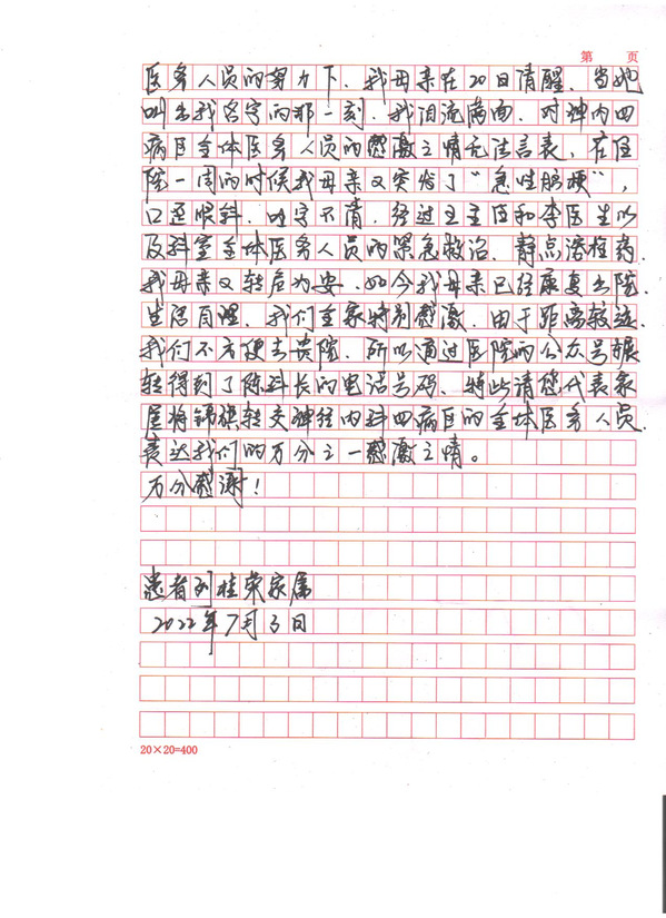 患者及家属邮寄来的感谢信,以及患者之间的口口相传,是给科室全体医护人员最大鼓励和肯定!我们每天坚守的诊疗岗位,我们医疗工作中每做的一件小事,无不感动着来齐医附属一院诊疗的每一位患者,就是这样一封封感谢信、一个个简单而平凡的故事、一位位患者的真情实感,让我们看到了患者及家属对我院医护人员的高度评价,实实在在的演绎了一段浓浓的医患情深。
