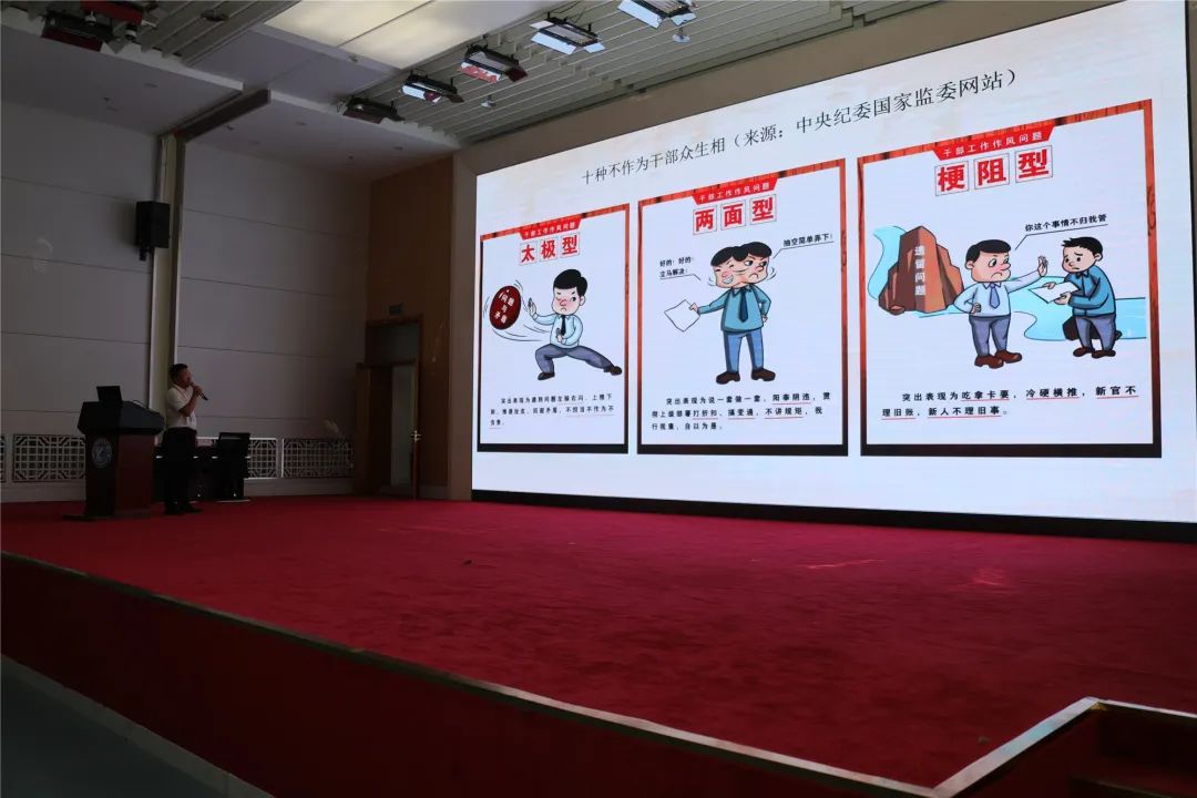 在加强干部能力作风建设和医院的思考实践方面,李院长以中央纪委国家监委网站发布的十种不作为干部众生相,一针见血的指出干部在工作中出现的“太极型”“两面型”“梗阻型”“三拍型”“走秀型”“说唱型”“比划型”“木偶型”“打盹型”“佛系型”十种不作为的干部。并逐一解释各种干部不担当不作为、形式主义官僚主义问题突出的典型表现,要求大家引以为戒!