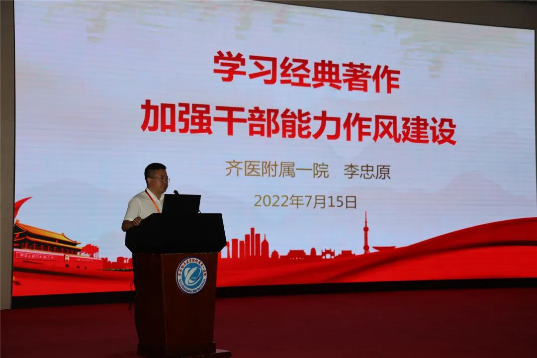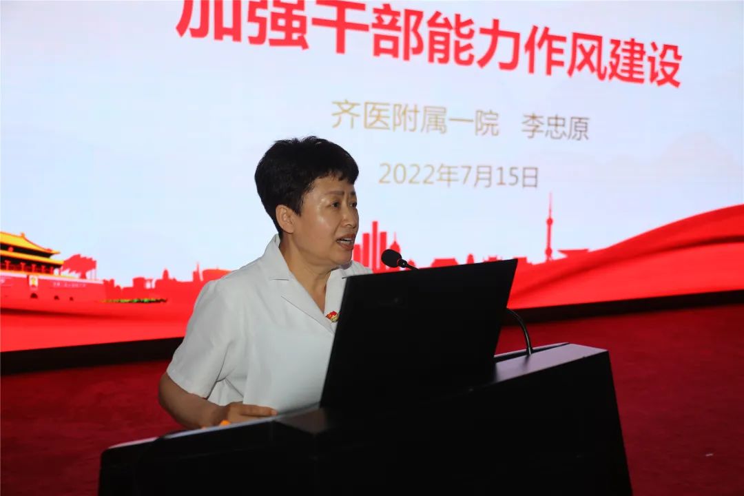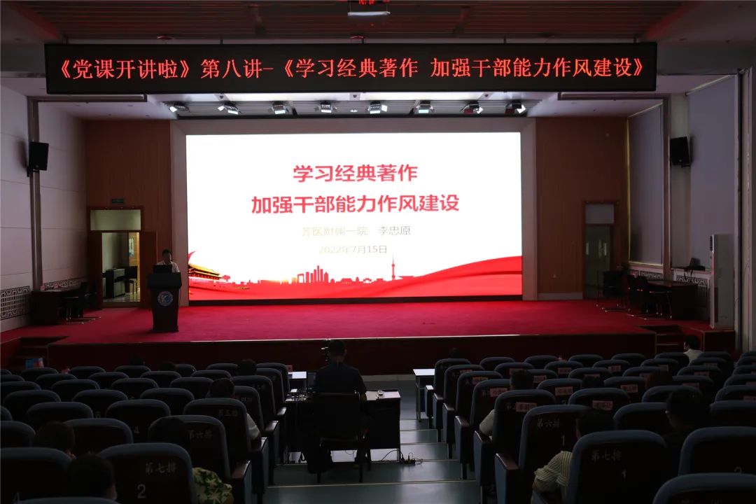 为进一步加强干部能力作风建设,7月15日,齐医附属一院院长、党委副书记李忠原以《学习经典著作 加强干部能力作风建设》为题讲授专题党课,这也是我院“党课开讲啦”第八讲。院领导、支部书记、支部委员、科主任、护士长、中层干部及全院党员500余人线上线下观看。讲座由党委委员吴颖主持。