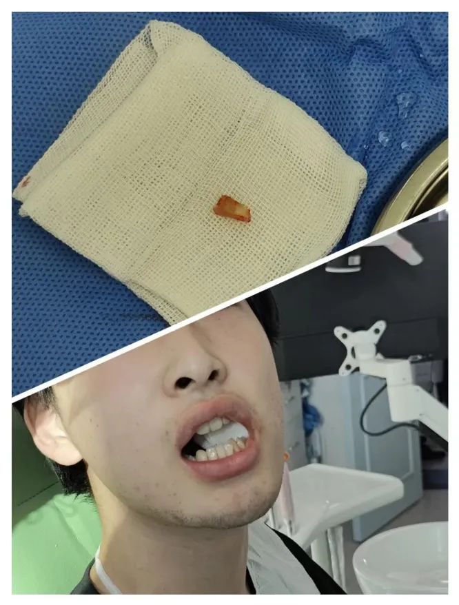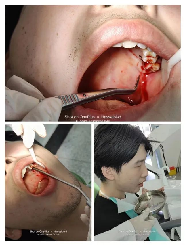 正当大家准备放弃该方案进而实施第二套手术方案时,薛徽主任决定再次尝试取出该牙根。薛主任首先将拔牙窝扩大,去除大部分牙槽骨,使用大量生理盐水冲洗上颌窦腔,并嘱患者将冲洗后液体及时吐至口腔弯盘内,观察异物是否取出,同时配合负压吸引器抽吸,在多次反复冲洗抽吸下,进入上颌窦内的牙根终于显露在术野内,最终被完整取出!由于上颌窦-口腔漏口直径已大于7mm,为避免该患者永久形成上颌窦-口腔漏口,薛主任为他做了一个小手术,将上颌腭侧粘膜瓣滑行转移至此,永久关闭该漏口。
