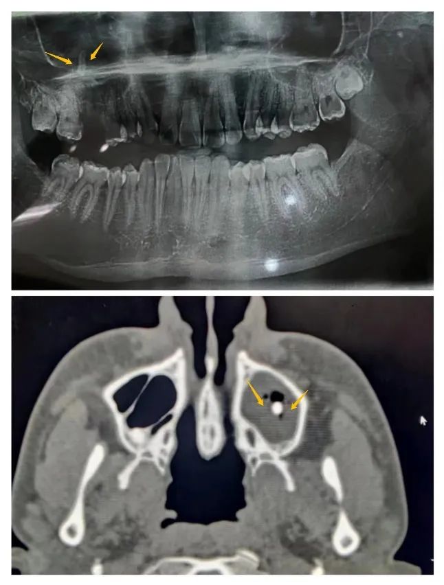 第二天,患者早早来到五官科病房,薛徽主任进行系统的临床查体,检查发现右侧上颌第一磨牙区颊侧牙槽窝空虚,腭侧牙根尚未拔除,捏鼻鼓气时可见大量气泡自拔牙窝涌出,考虑上颌窦-口腔已穿通,但牙根的具体位置尚不明确。紧接着,薛徽主任为患者开具上颌骨CT平扫检查单,进行冠扫及口腔全景片检查。影像学检查结果显示疑似牙根样高密度影位于上颌窦中央略偏右侧前壁位置,窦腔内可见大量低密度影包绕牙根,考虑为拔牙后血性分泌物或异物进入窦腔后机体产生的炎性分泌物,这给异物取出带来了极大的难度。