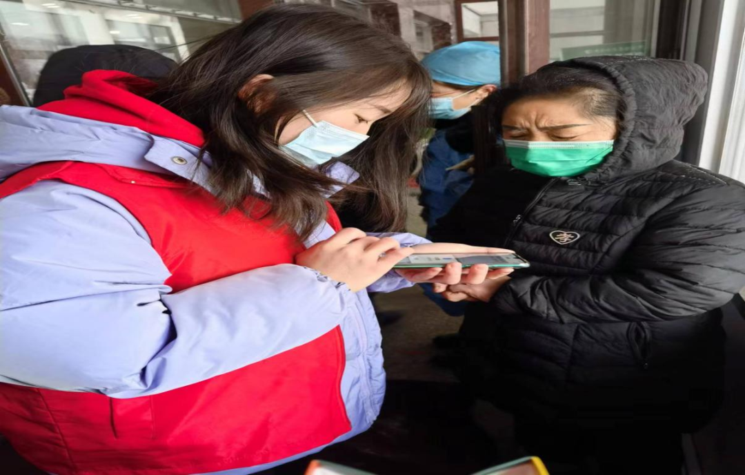 引导群众保持一米距离、正确佩戴口罩、使用鹤城健康码等。