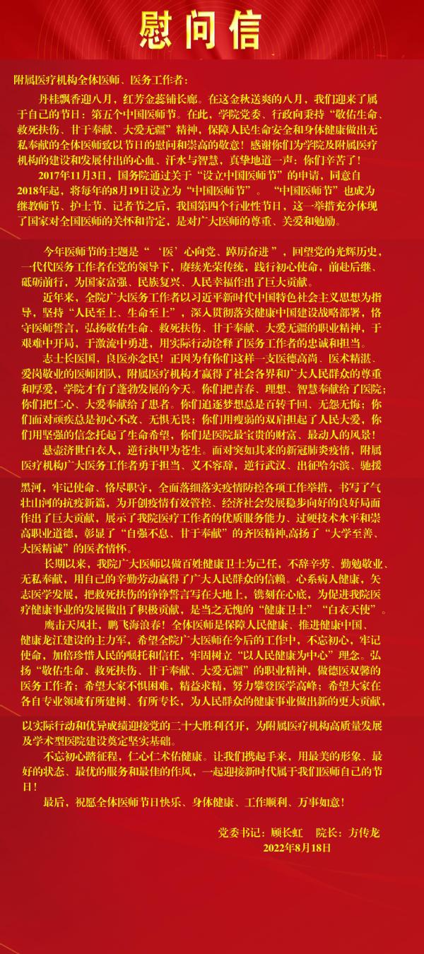 领导关怀—学院党委书记顾长虹、院长方传龙致全体医师、医务工作者慰问信