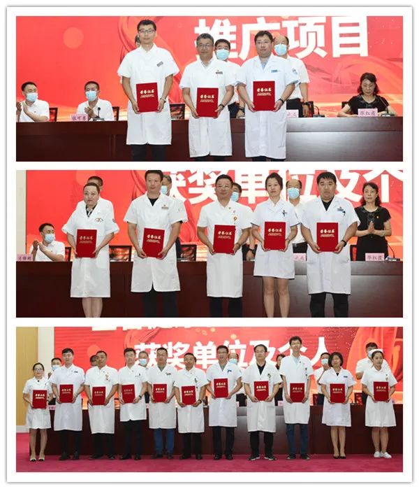 会上,学院党委副书记崔光成、副院长丛明宇、张可勇、工会主席何宪坤分别宣读了《黑龙江省第二届“龙江名医”表彰决定》《齐齐哈尔医学院关于命名表彰第三届“齐齐哈尔医学院名医”的决定》《齐齐哈尔医学院关于公布2022年度学院医疗卫生新技术推广项目评审结果的通知》《关于公布健康知识普及行动—全省健康科普能力大赛获奖名单的通知》《关于公布2022年黑龙江省优秀科普微视频作品名单的通知》。大会表彰了10位龙江名医、15位学院名医、20项学院医疗卫生新技术、2个省健康科普能力大赛获奖单位及获奖项目、1个省优秀科普视频作品征集评选活动获奖单位。受表彰单位和个人代表依次上台领奖,学院领导为受表彰人员颁奖,并向他们表示诚挚祝贺。