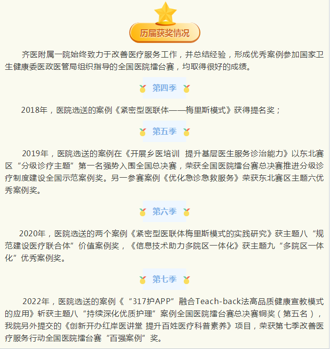 荣誉的背后,是医院对改善医疗服务行动的高度重视,是医院以患者为中心,切实推动医疗服务高质量提升,智慧医院建设、信息化健康宣教等方面所做出的努力。近年来,齐医附属一院把改善患者就医体验、提升服务质量作为贯穿全院的重要任务,自2019年5月起,医院创新应用“317护APP”融合Teach-back法高品质健康宣教模式。截止到目前,累计在线宣教课程800余篇,课程推送人数30000余人,课程推送量285000余篇,课程阅读率79%以上。全院临床科室应用覆盖率达100%。全新健康宣教模式的实施,持续改善医院在院患者健康教育质量,整体提升患者满意度,助力医院家庭医生签约工作,提升医院“一病一品”专科服务水平,促进医院健康宣教品牌建设。同时,为出院病人提供延续服务并与病人建立紧密联系,真正实现从患者入院到出院及居家养护的全方位宣教闭环管理。未来,医院智慧医院建设,信息化宣教平台发展过程中,将全面深化“以患者为中心”的服务理念,使医患关系更加和谐。
