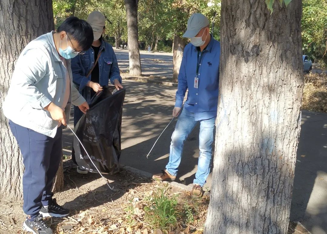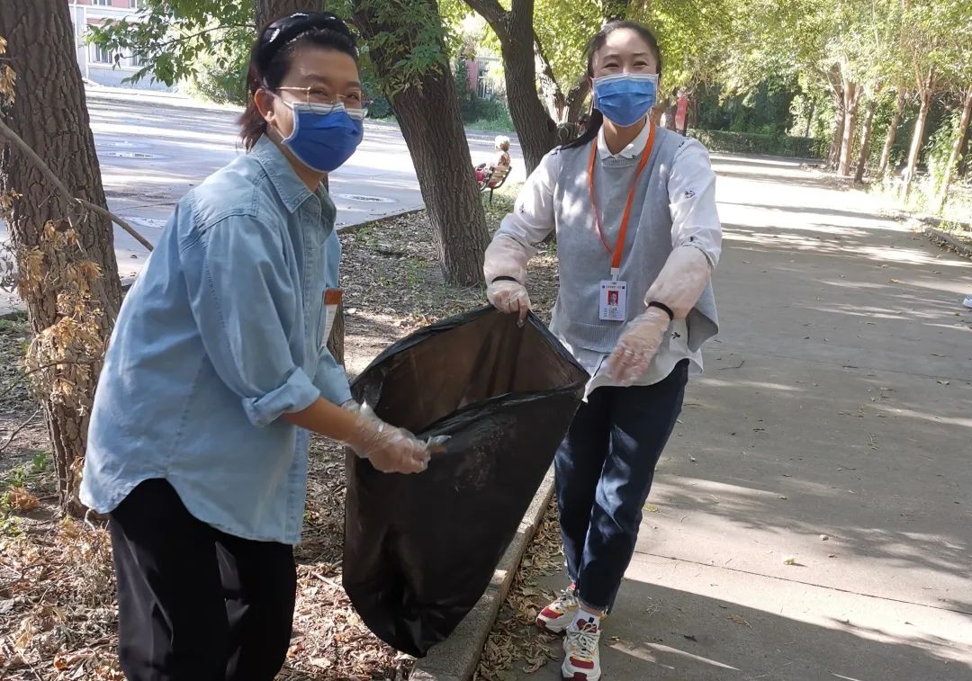 支部党员在医院24号院机关楼后侧,将树丛中散落的白色垃圾、宠物粪便、枯枝落叶等垃圾清扫干净,为职工工作、学生实习提供舒心的环境。