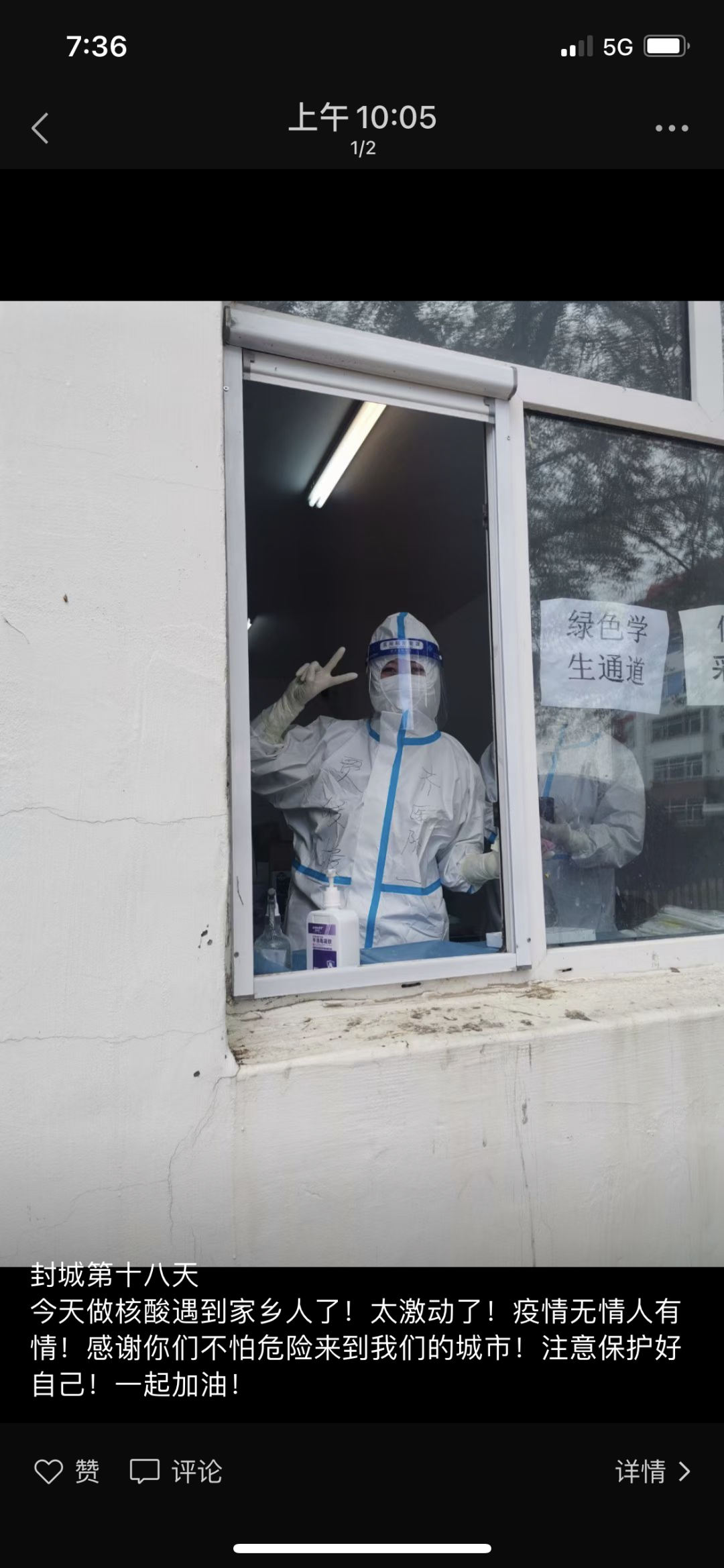 今天在采集核酸时,遇到了一位漂亮的姐姐,她特别激动的对我说“你是来自齐齐哈尔的支援团队啊?看到你真的是太亲切了,我的老家也是齐齐哈尔的。”我们彼此都很激动,由于工作的原因只是简短的问候了两句,等到中午的时候,姐姐特意送来了月饼,和我说“自己做的东西怕不安全,这些都是带包装的,你消消毒拿着吃,你快忙,辛苦了!”随后摆手匆匆离去,顿时我觉得自己所做的一切都是值得的!
